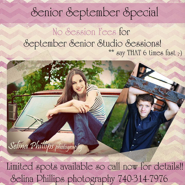 Okay, I jumped the gun a little on announcing this, just to give everyone a chance before the dates fill up.  Yep, you’re reading it right, no session fee for studio sessions for seniors in September.  Here are the details: